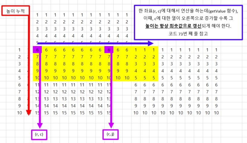 height(); // 한 좌표(r, c)에서의 높이 누적합(그림 참고)
