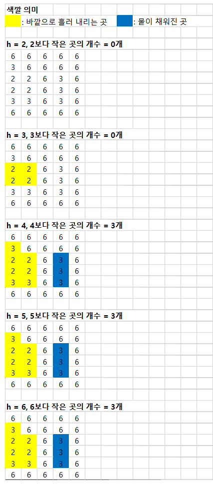 main() 함수 내의 for문 h의 의미는 "h보다 작은 곳을 찾아 높이를 딱 h까지 채우겠다."라는 의미로 해석하면 된다.