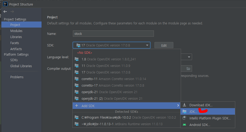 intellij 프로젝트 JDK 설정 오류 및 JDK 추가 본문
