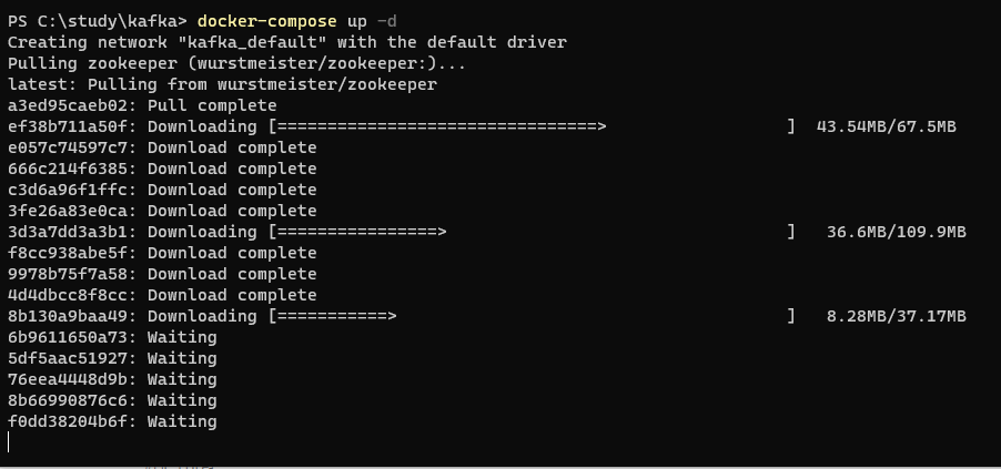 위에 내용 모두 저장한 후에 아래 명령어로 카프카를 실행한다.(최초 다운로드 후 실행)