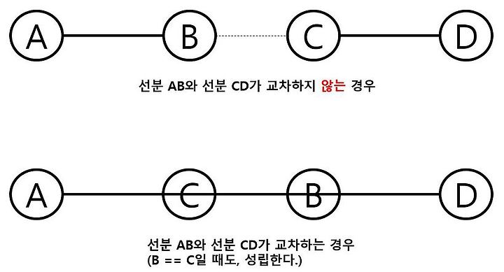 선분 AB와 선분 CD가 교차하려면,