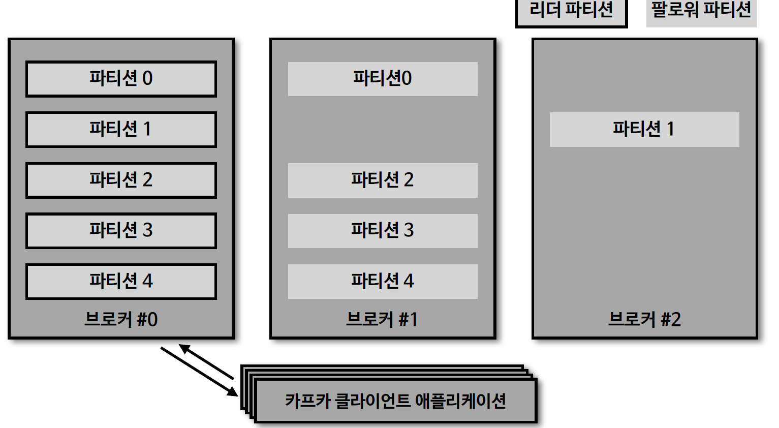 - 프로듀서 또는 컨슈머와 직접 통신하는 파티션을 리더, 나머지 복제 데이터를 가지고 있는 파티션을 팔로워.