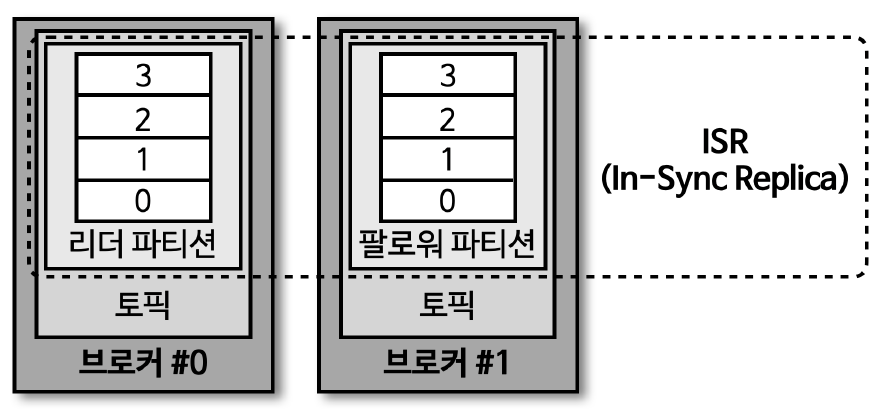 - ISR은 리더 파티션과 팔로워 파티션이 모두 싱크가 된 상태를 의미함.